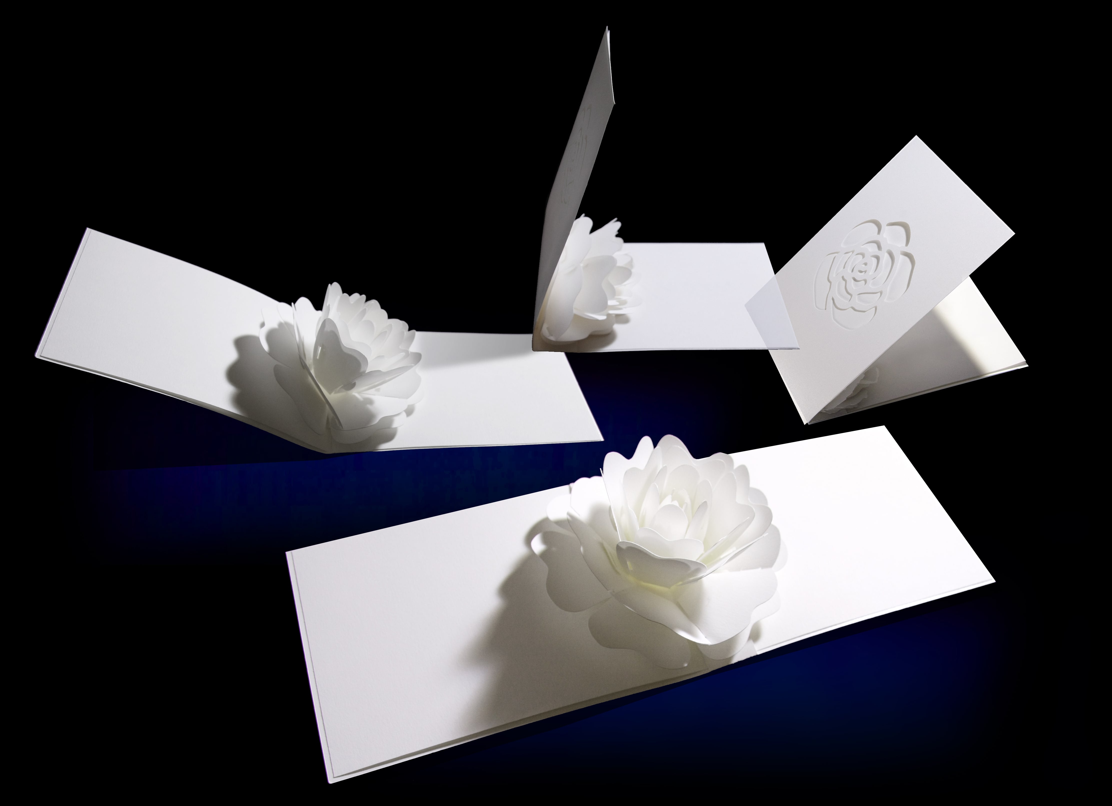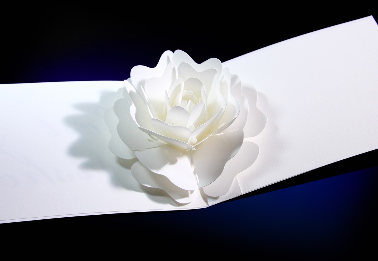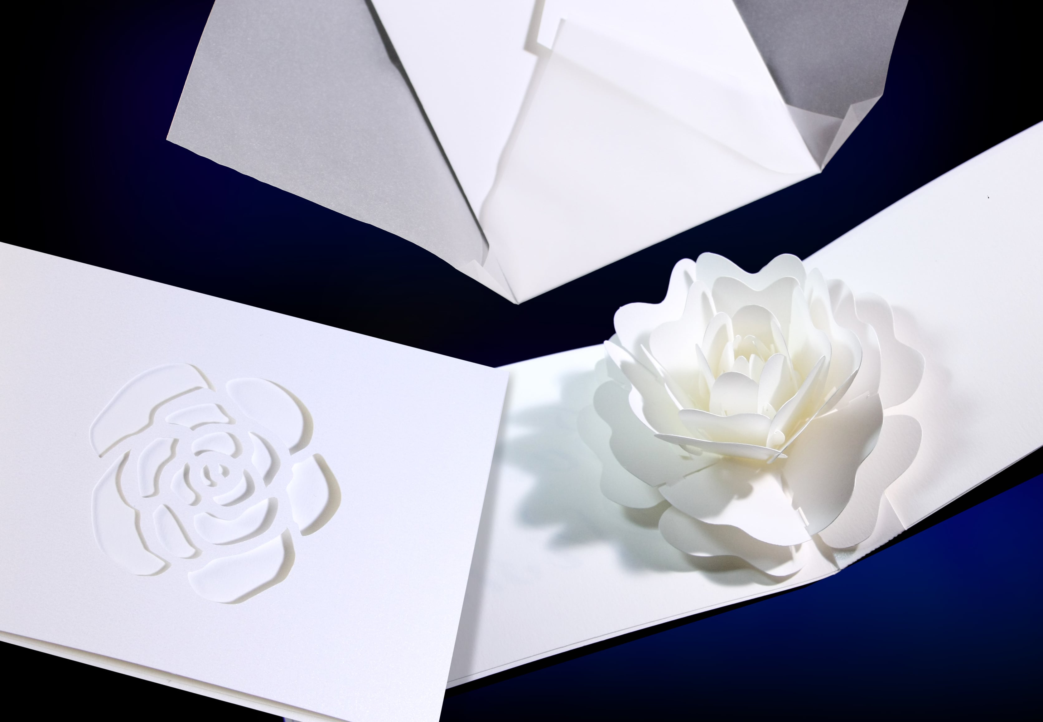 カードを開くと、カメリアが咲くように現れるポップアップグリーティングカードです。まるで生花のようなボリュームのある立体的なフラワーカードに、心を込めたメッセージを添えて贈ることができます。