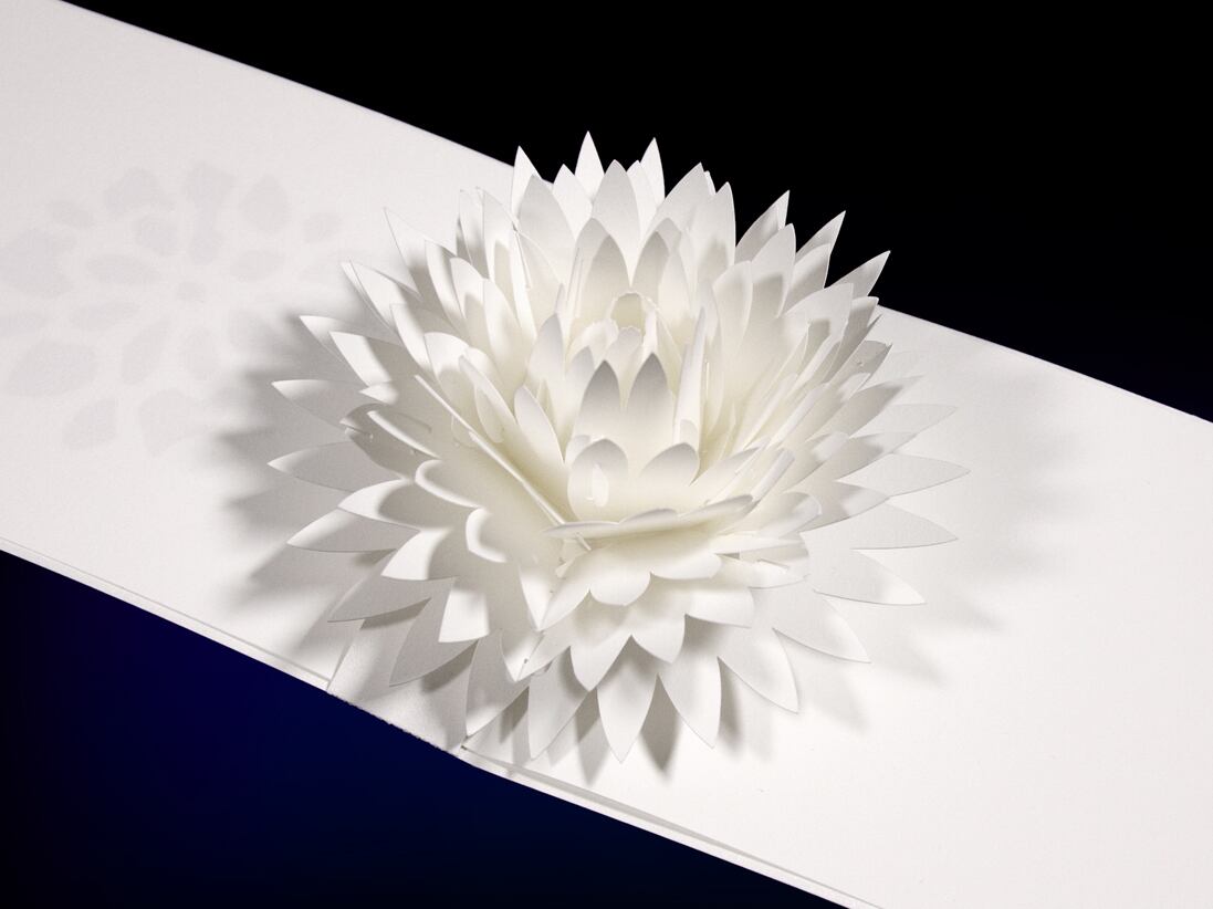 カードを開くと、ダリアが咲くように現れるポップアップグリーティングカードです。まるで生花のようなボリュームのある立体的なフラワーカードに、心を込めたメッセージを添えて贈ることができます。
